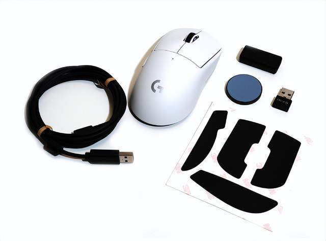 这款鼠标有黑、白、粉三种颜色可选,拆开包装,配件很简洁:一根充电线、一个USB接收器加收纳器、一张保护贴纸,还有一个替换用的接收器收纳仓磁吸盖,都是日常能用得上的基础配件。